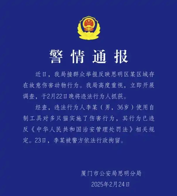 有爱猫人士在厦门前埔医院附近喂养流浪猫时,发现猫被人用铁箭给射伤,让人看了十分揪心。近日,射猫的36岁男子已经被警方拘留了。