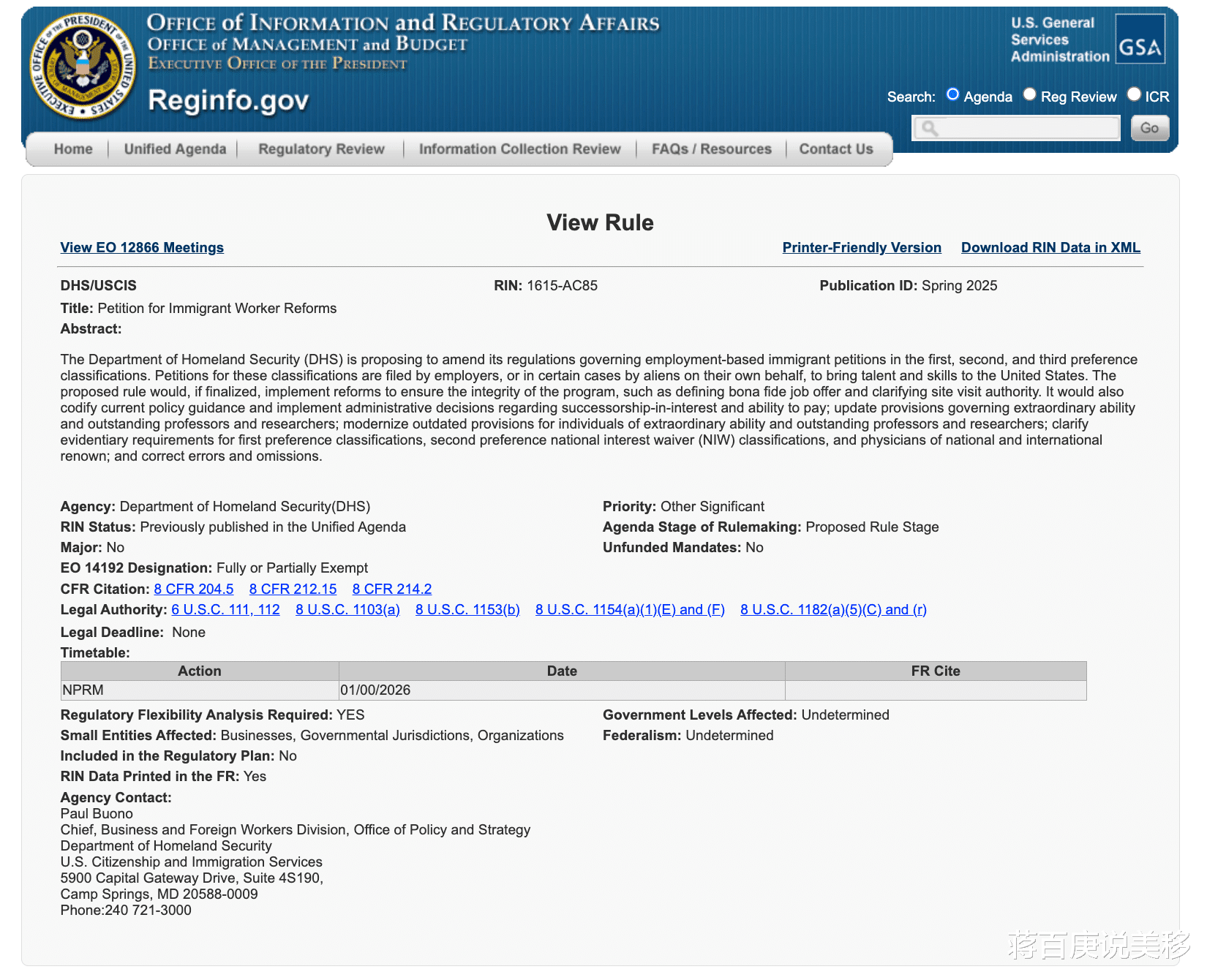 在此次计划中,有一项是针对职业移民绿卡的改革内容,主要内容包括:更新杰出人才EB-1A和杰出教授及研究人员EB-1B的申请条款,改进EB-1A和EB-1B绿卡申请中相对过时的条款;明确EB-1和EB-2项下的国家利益豁免NIW、以及国内外知名医生的证据要求;编纂现行政策指导并执行有关利益继承人和支付能力的行政决定;定义职业移民绿卡申请中要求的bona fide job offer,并明确现场实地考察的权限;纠正现行政策中的错误和遗漏。目前看这项改革计划预计在2026年1月发布。