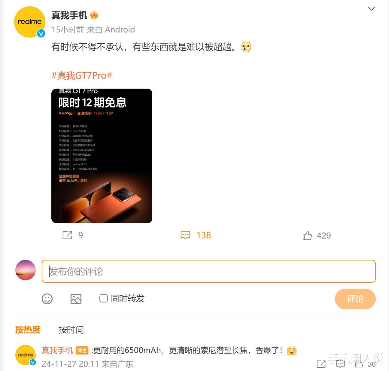 K80 Pro和真我 GT7 Pro直接就是对上了,27日这天真我官方就发布了个海报,表示:有时候不得不承认,有些东西就是难以被超越。K80 Pro发布后,真我手机更是信心满满表示:更耐用的6500mAh,更清晰的索尼潜望长焦,香爆了!