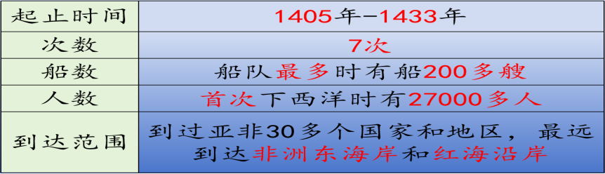 二、特点和地位:郑和下西洋时间早、次数多、规模大、范围广;是世界航海史上空前的壮举。