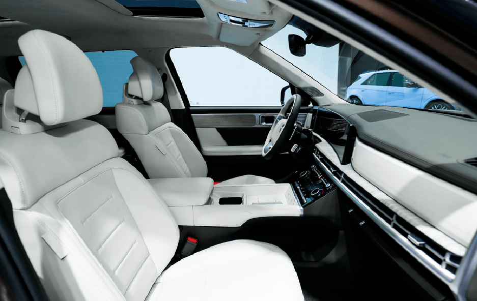 而当我们走进车内,第五代胜达的内饰设计同样让人惊艳。双12.3英寸贯穿式连屏,搭配下方贯穿式的空调出风口和氛围灯,将豪华与科技感完美融合。三幅式方向盘,与索纳塔有些相似,但更显得厚重有力,与这款SUV的气质相得益彰。