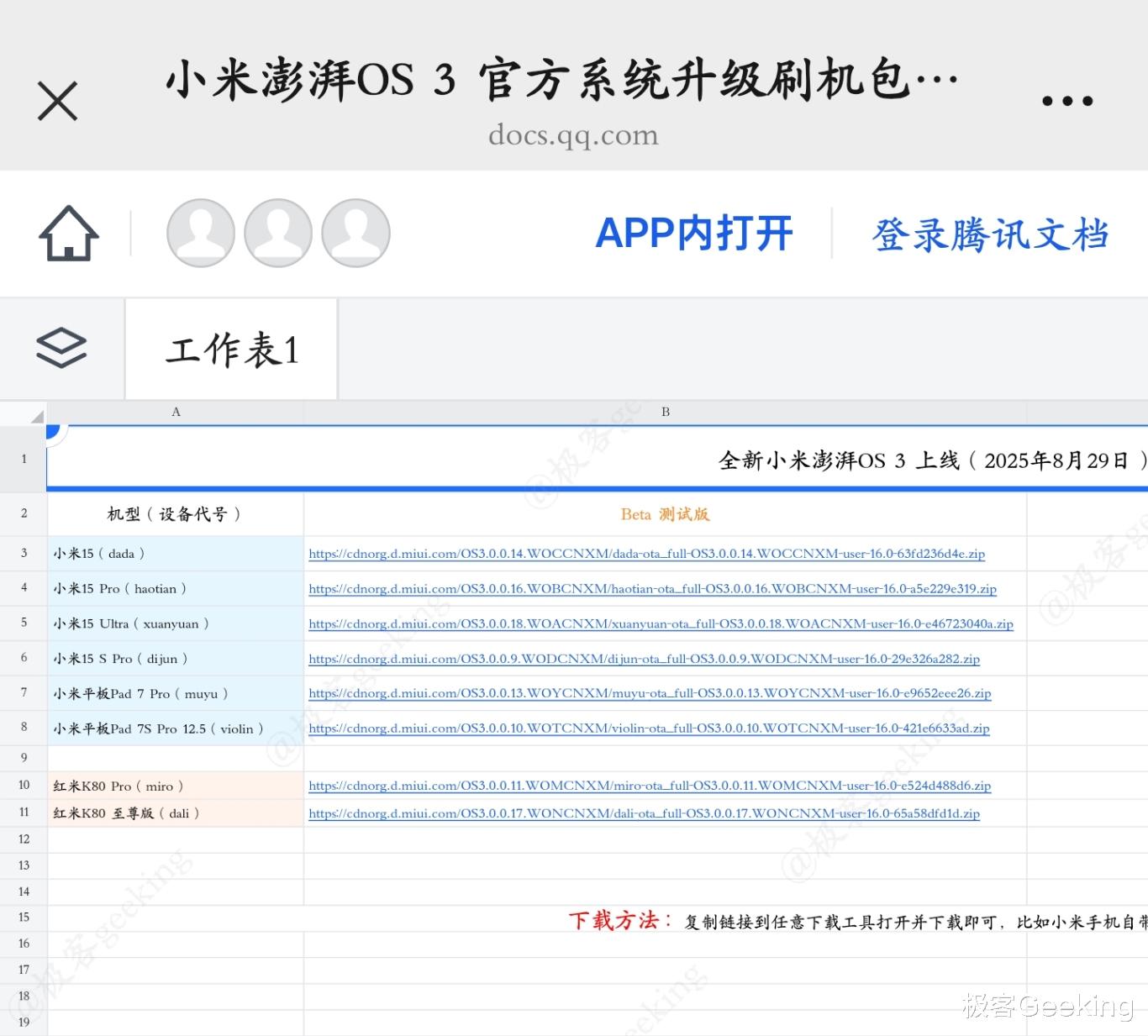如何获取全新小米澎湃 OS 3 的官方系统升级刷机包下载?就像初代和澎湃OS 2,这次极客君依然做了一个在线文档,持续更新小米澎湃OS 3 的系统包下载链接,包括 Beta 版和正式版,关注我并私信发送口令 “澎湃OS3” 即可获取。