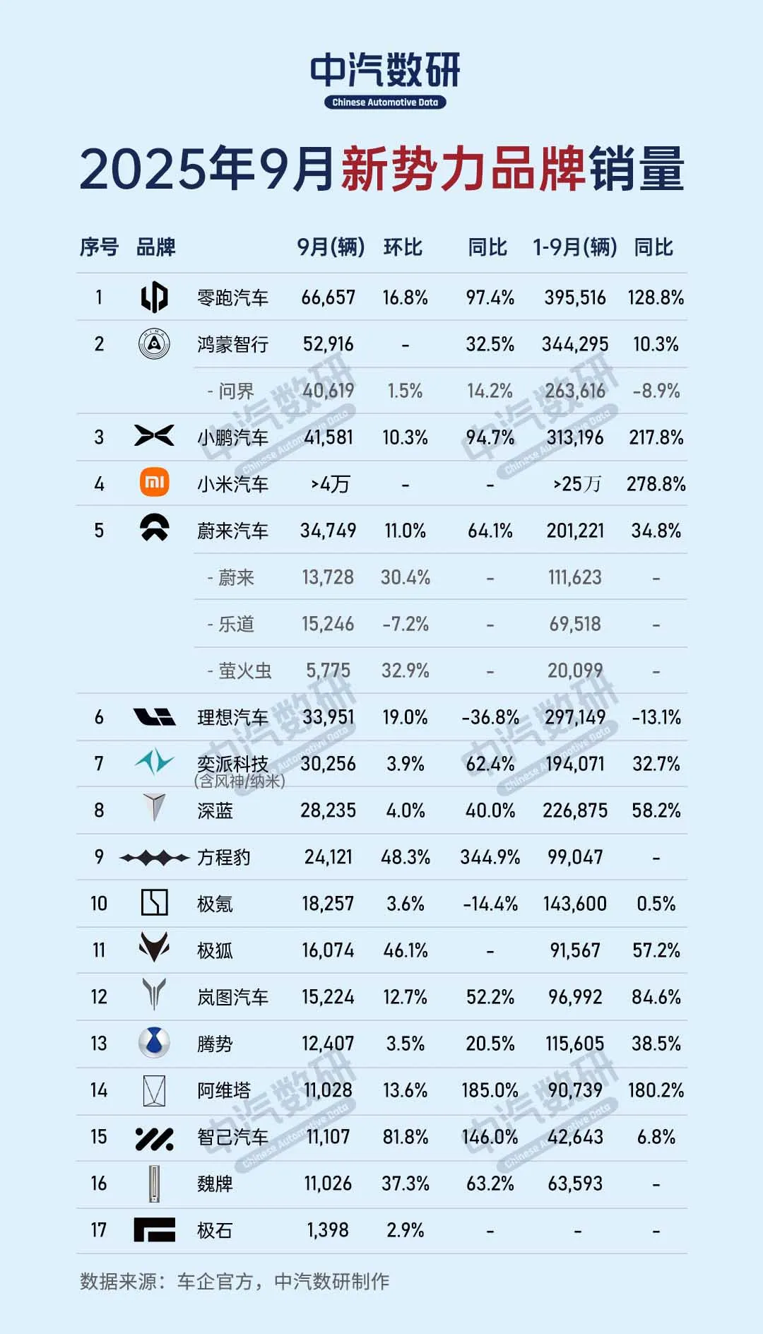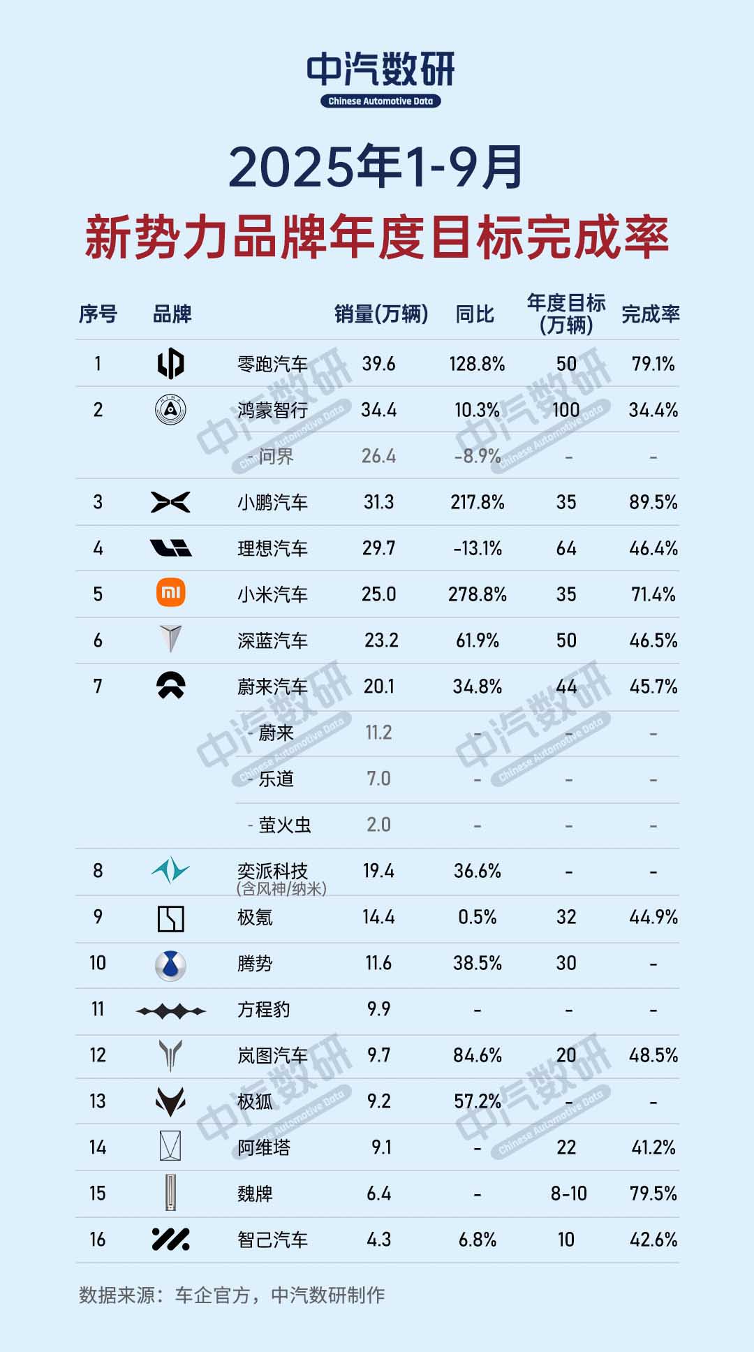 1-9月新势力累计销量及年度目标完成情况:零跑、小鹏、小米、魏牌完成率前四,鸿蒙智行、理想、蔚来掉队