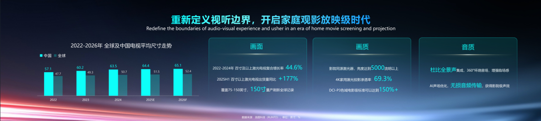 尺寸升级之外,也迎来画质与音质的双重飞跃:家用激光投影亮度突破5000流明,4K分辨率的渗透率达69.3%,DCI-P3色域覆盖150%以上,结合杜比全景声与AI声场优化技术,让家庭客厅实现“放映级影院”的沉浸体验。