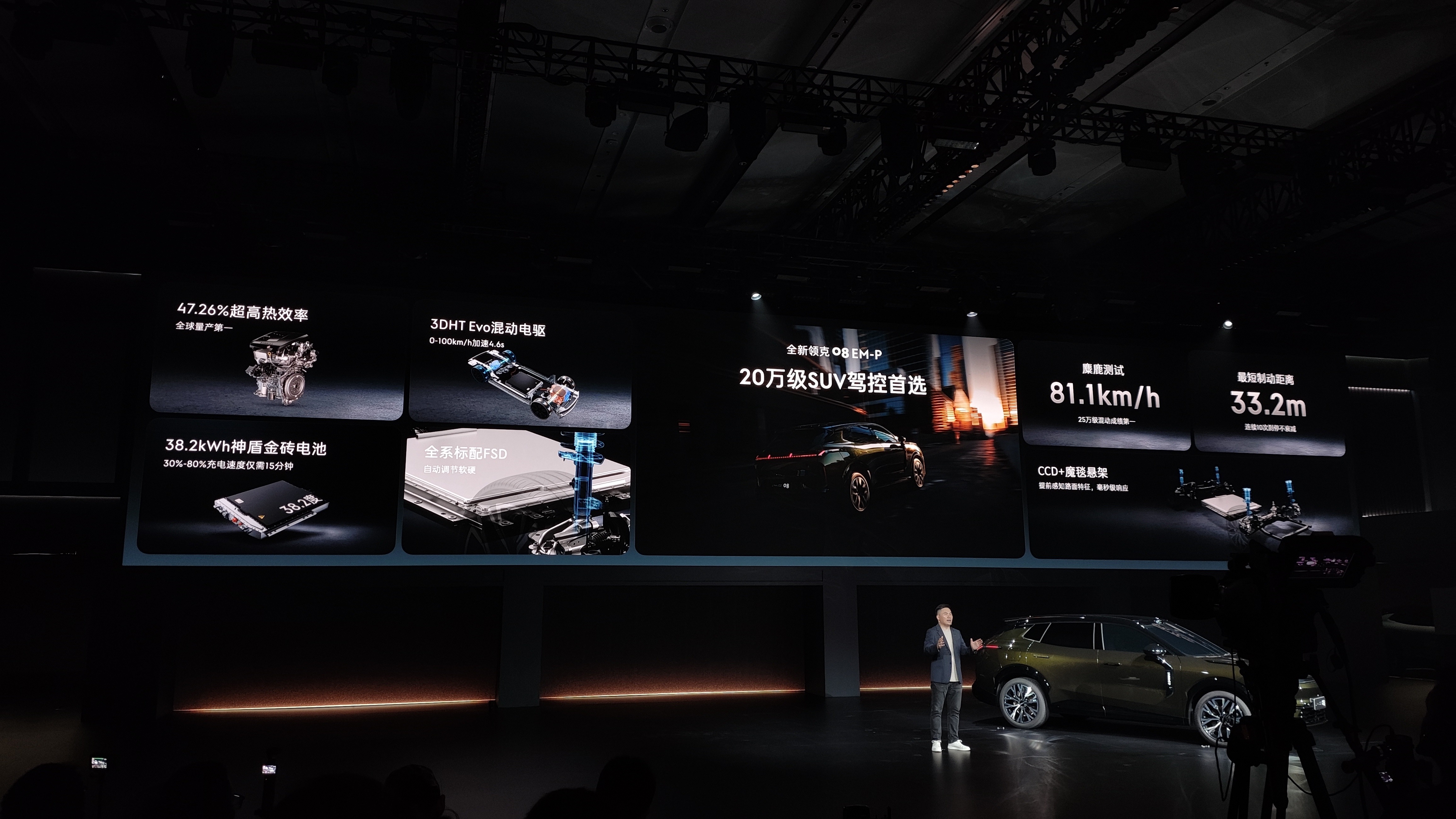 动力及驾驶方面,新车搭载最高热效率47.26%、最大功率120kW的1.5T发动机+3挡DHT+180kW P3电机组成的插混系统,两驱版车型最大功率300kW,匹配28.3/38.2kWh磷酸铁锂电池包,CLTC纯电续航160/230km,WLTC亏电油耗5.5L/100km。