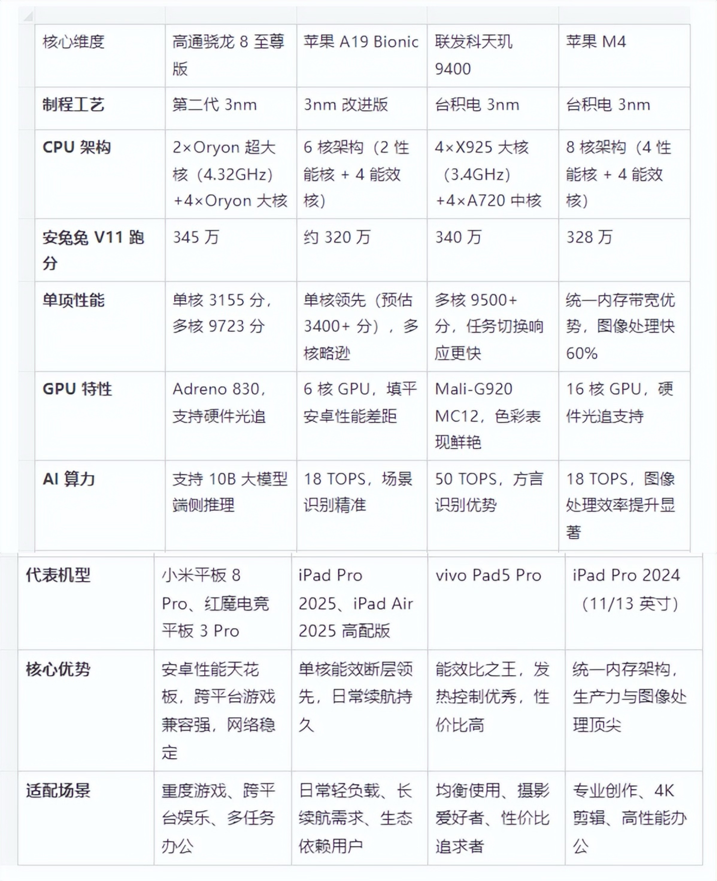 综合来看,2025 年平板芯片梯队中,骁龙 8 至尊版与苹果 A19 Bionic 稳居第一梯队,前者以安卓阵营最强性能、出色能效比和跨平台兼容性见长,后者则凭借单核性能优势占据一席之地。对于追求安卓平板极致性能的用户,搭载骁龙 8 至尊版的小米平板 8 Pro 无疑是最优选择,其 “文能办公、武能游戏” 的全能表现,完美诠释了第一梯队芯片的实用价值。