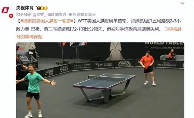 男单正赛首轮比赛中,国乒主力选手梁靖崑以2-3不敌世界排名仅85位的法国资格赛选手力廉·巴德。