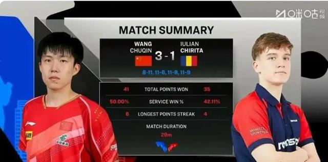 第一局比赛失利,王楚钦迅速调整好状态,接下来的二、三、四局比赛皆获得胜利且压制对手,11-6、11-9、11-9,总比分3:1取得胜利。