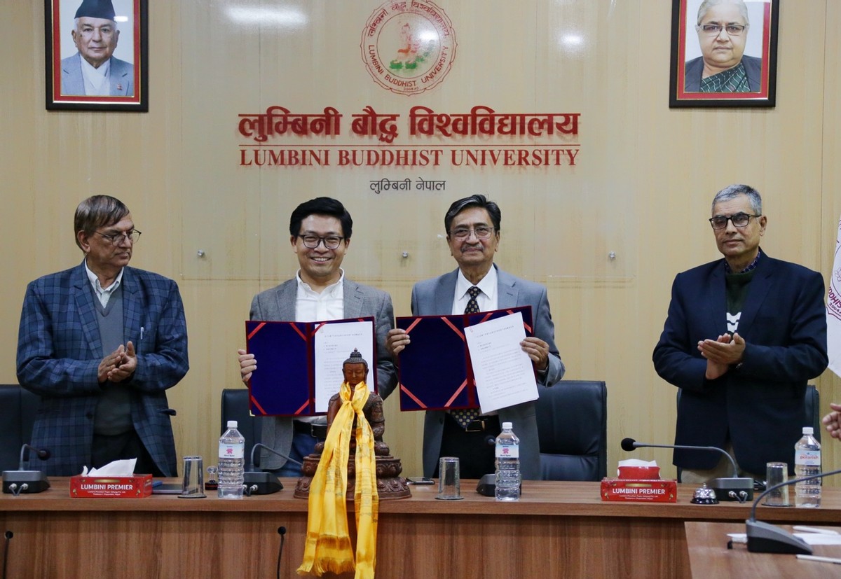 苏巴纳·拉尔·巴杰拉查里亚校长(Dr Subarna Lal Bajracharya)与徐浩理事长分别代表蓝毗尼佛教大学与澳门国际青年智库正式签署合作谅解备忘录