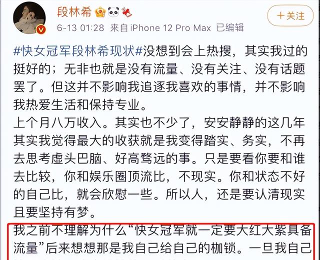 她过于依赖冠军的光环,把大部分时间花在了上综艺和商演上,忘记了自己的初心,甚至连自己曾经扬言最热爱的音乐创作,她也抛诸脑后了。