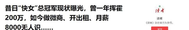 部分参考资料:昔日“快女”总冠军现状曝光,曾一年挥霍200万,如今做微商、开出租、月薪8000无人识——读者