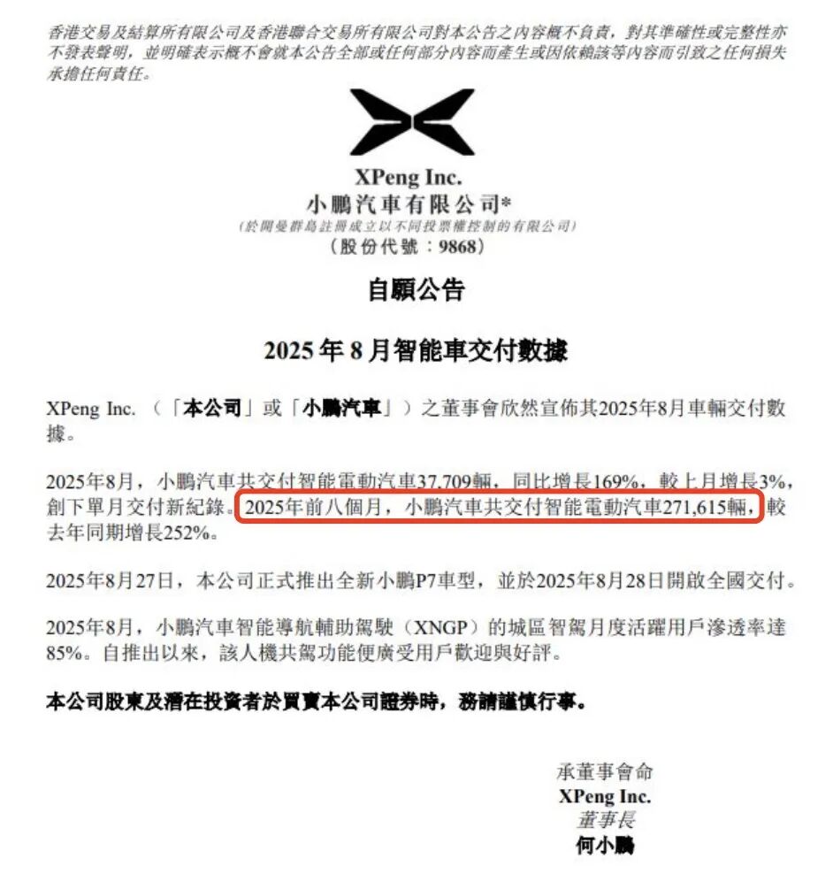 小鹏汽车成立比蔚来还早几个月,自2025年以来,小鹏汽车的销量才真正稳步上涨。2025年上半年,小鹏已经累计交付新车19.72万辆,超过2024年全年交付量。截至2025年8月,小鹏累计销量达27.16万辆,同比增长252%,2025年全年销量目标为40万辆,已完成目标的68%。