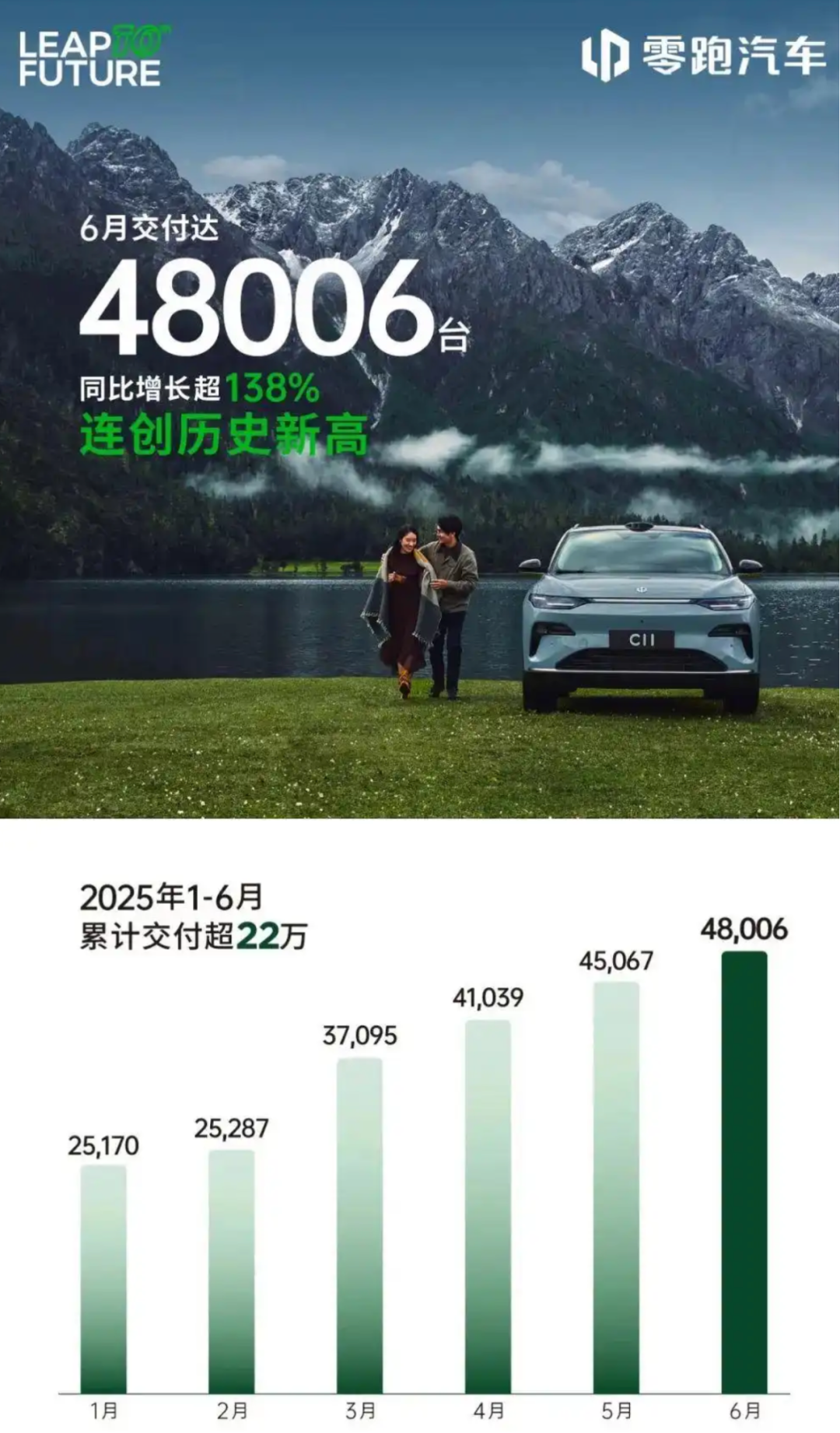 2025年上半年,零跑累计交付新车22.17万辆,同比增长幅度高达155.7%;对比之下,理想总交付量为20.39万辆,同比微增7.9%。
