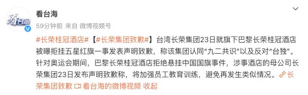 终于顶不住了,长荣集团23日就巴黎长荣桂冠酒店拒挂中国国旗一事发表声明致歉,称认同“九二共识”,反对“台独”。