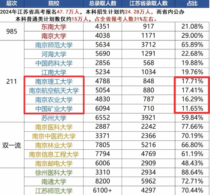 而从一份2024年江苏省内11所211的录取数据分析来看,11所211高校中仅有5所录取比例超过了20%,其中南师大和苏州大学还是省属211,而录取江苏生源最低的院校矿大让很多人十分意外,仅有11.65%。