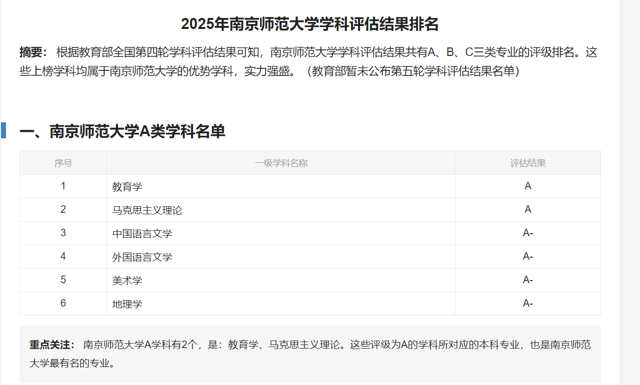从第四轮学科评估中可以看到,南师大虽然没有A+学科的出现,但A和A-学科却达到了6个(其中,马克思主义理论、教育学2个学科获得A,美术学、地理学、外国语言文学、中国语言文学4个学科获得A-),这样的数量遥遥领先于同类高校。