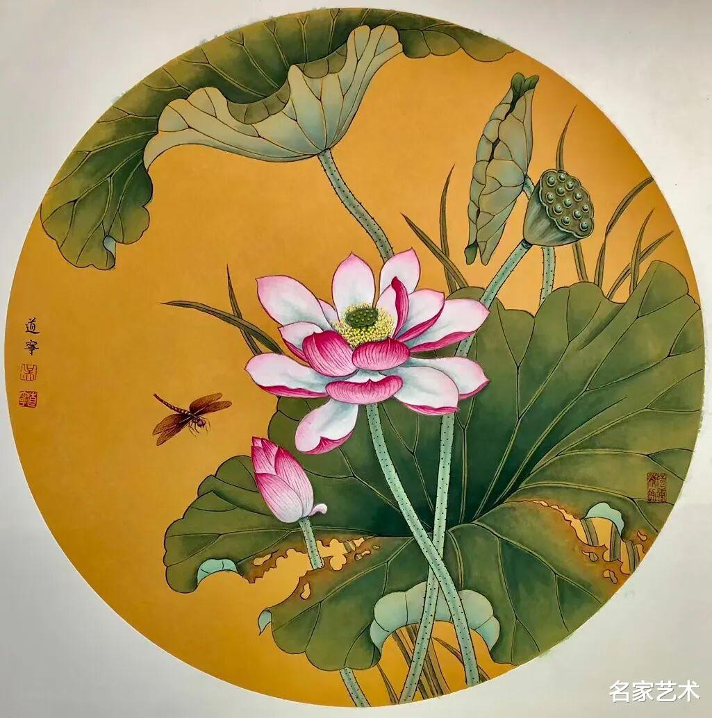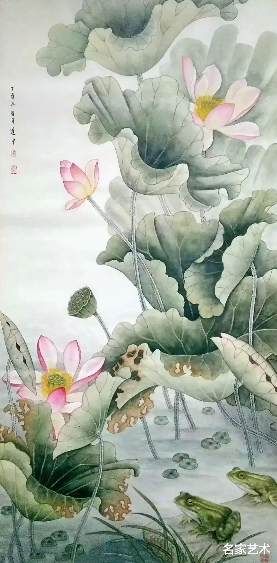 观其《莲花图》,那默然绽放的莲花,以其圣洁的花瓣和明亮的黄色花蕊,尽显其“出淤泥而不染”的高贵之美。吴道宁运用其精湛的着笔技艺,精心勾勒出莲花每一片花瓣的纹理;那层叠交错的花瓣,栩栩如生,让人仿佛能触摸到其被清露打湿的质感,那莲花恰似正在微风轻拂中轻轻摇曳,散发出一股淡淡的幽香,令观者不由自主地沉浸在这份宁静与祥和之中。