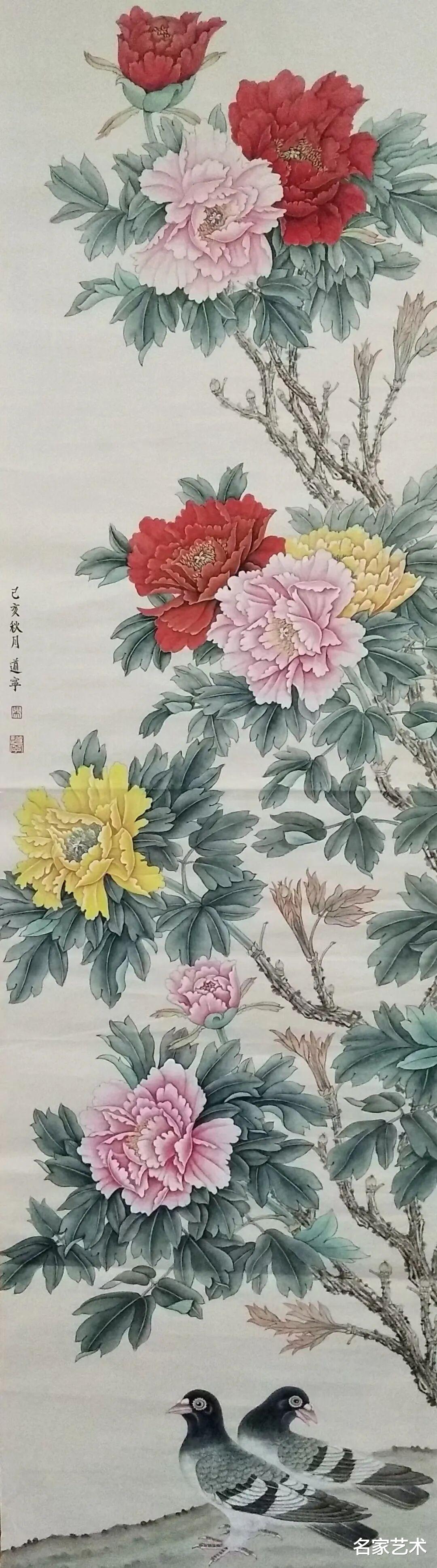一走入吴道宁的工笔花鸟画世界,一幅又一幅“大胆落墨、循序有致、细心收拾”而成的画面映入眼帘,顿觉诗意盎然、美不胜收;尤其是那精湛细腻的笔触、丰富斑斓的色彩、精微生动的线条,如乐韵飞扬,令人恍若置身于阆苑之中。