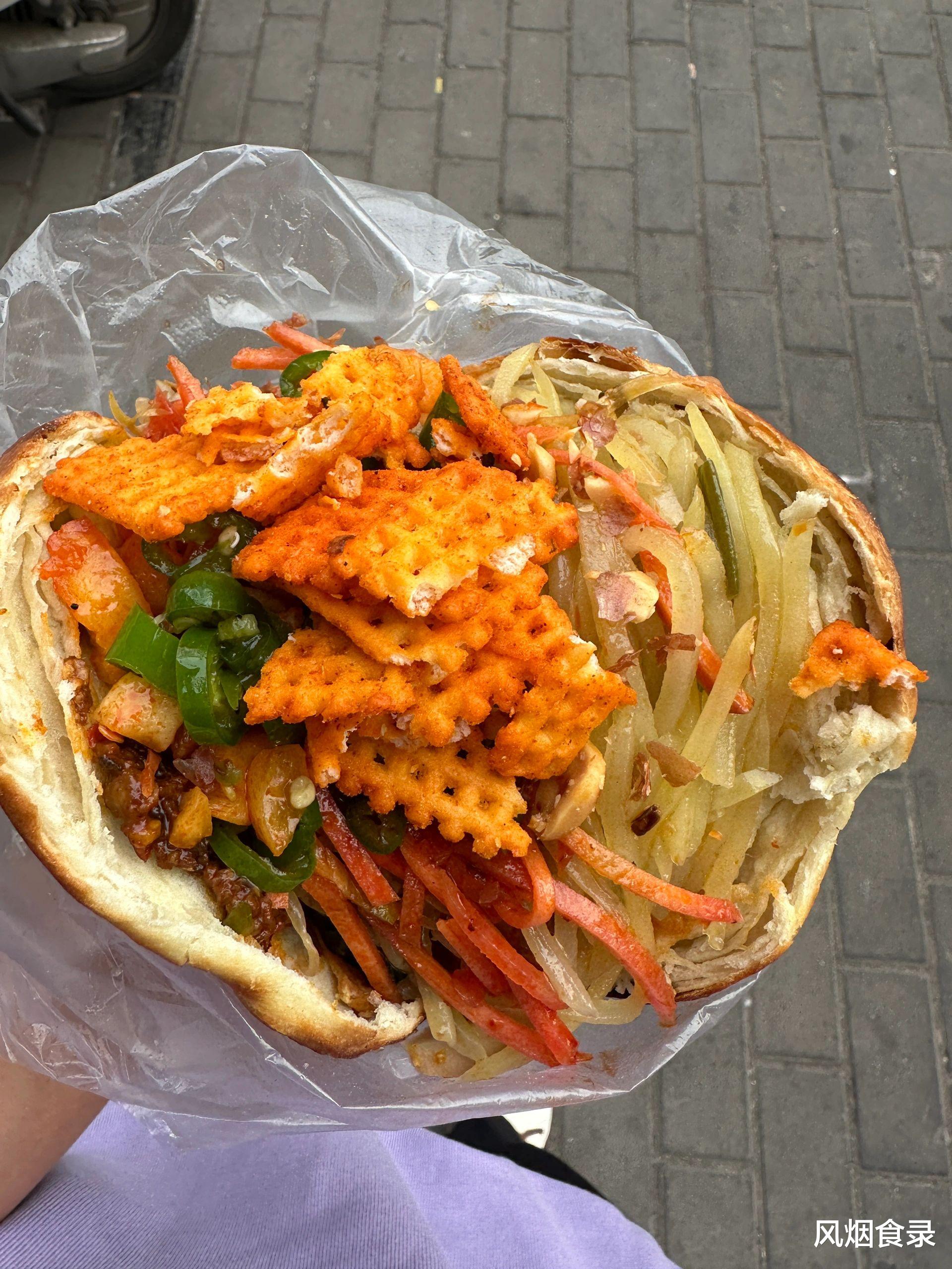 夹入现炒土豆丝、胡萝卜丝、卤蛋等,酱料必用本地香醋辣子,酸辣脆生,一咬“咔嚓”作响。