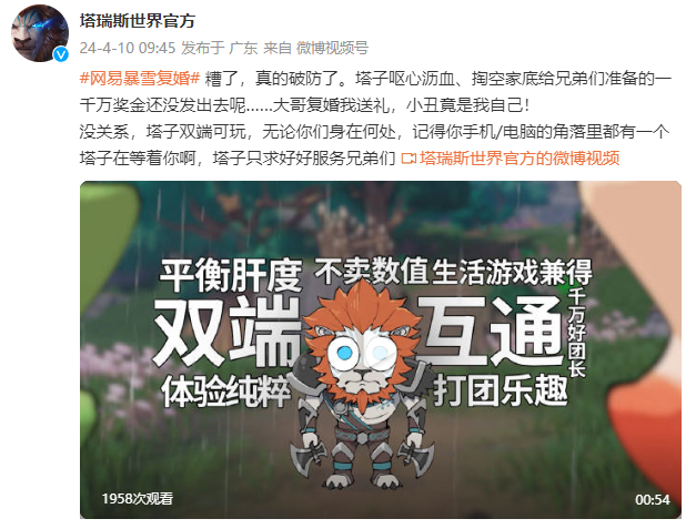 玩归玩,闹归闹,《塔瑞斯世界》这波“心碎”整活的背后,其实也是他们对自己产品质量自信的表现。毕竟在过去,多少号称“魔兽终结者”的游戏都用浩大的声势,想要盖住魔兽的光辉,但最终都以失败收场。反而是《塔瑞斯世界》,能用从容淡定甚至是自嘲的方式去迎接魔兽国服归来——所以你看,这就叫气度!