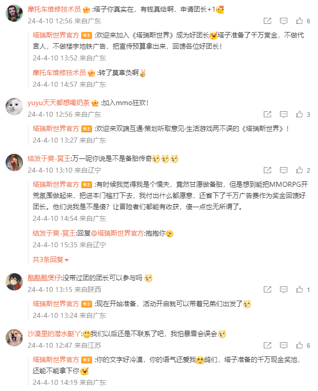 更令人意外的是,《塔瑞斯世界》似乎很快就找回了状态,发布微博再次重申了邀请优秀团长加盟的消息。不仅如此,他们还连抽十张100元的京东卡作为奖励,“千万广告费,省下来!送给中国好团长!”