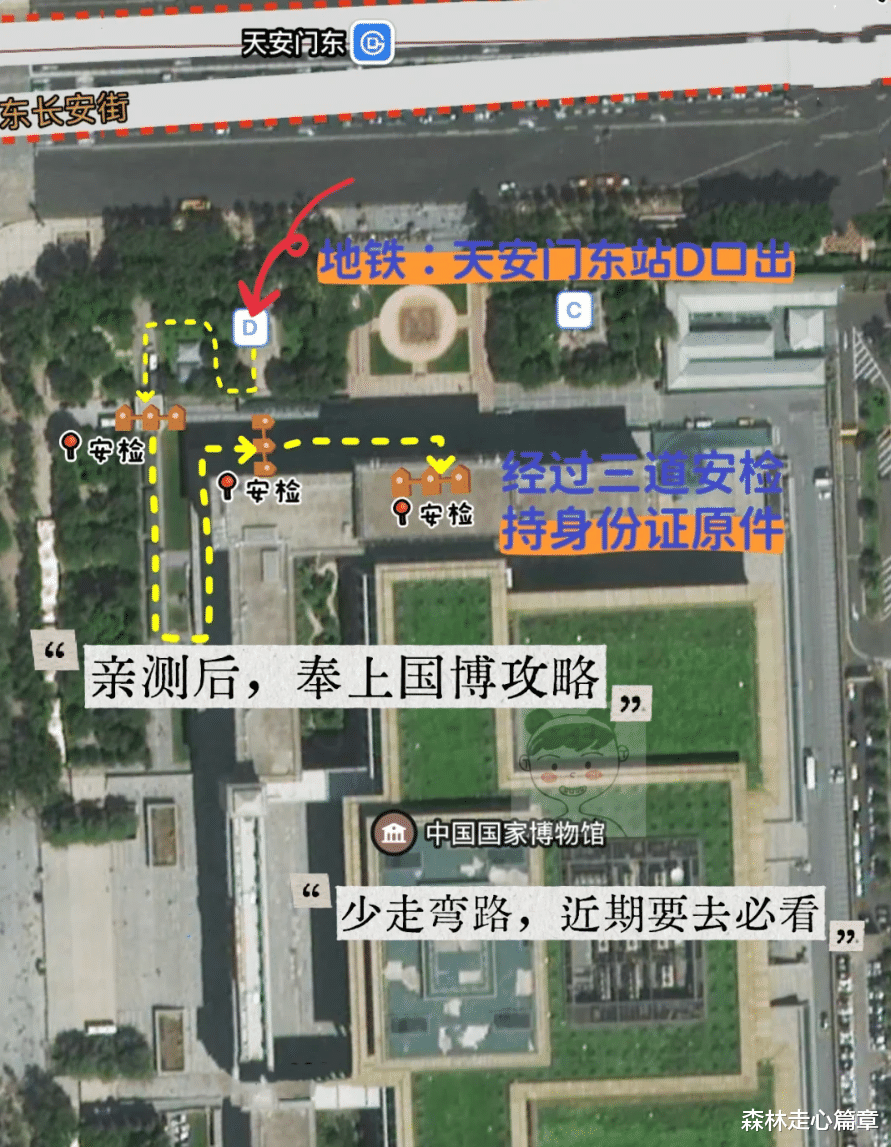 建议:1号线天安门东站D出口,直接进入国博安检口,不要走c口!也不要走前门地铁站(要绕路一大圈好几公里)!不需要进天安门广场的安检��,禁带两万以上充电宝禁打火机禁自拍杆三脚架,禁止展厅内使用充电宝,禁饮食,禁开启闪光灯!进馆一定优先去古代中国,把最好的精力放在这个展厅!