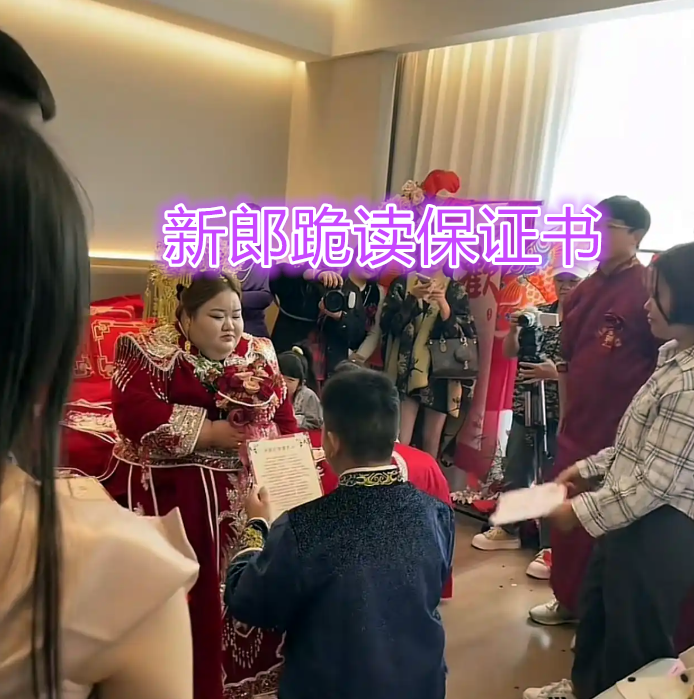新娘给男子准备了一个保证书,其中男子念着台词“婚后所有的事情都要自己做,一切听老婆的安排,老婆的话要听从,老婆的建议要顺从,老婆生气的时候,要哄老婆开心”