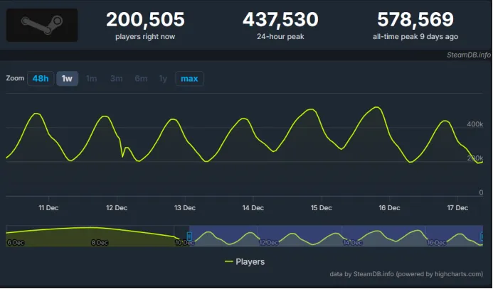 12月7日,《流放之路2》开启了抢先体验,预购玩家超过100万,上线后更是吸引了全球几十万玩家同时狂挤服务器,单看steam平台一家的数据就已经足够亮眼,游戏推出后24小时同时在线玩家数量就超过45万,历史最高在线玩家数超过57万,在steam每周销量榜连续霸榜两周。