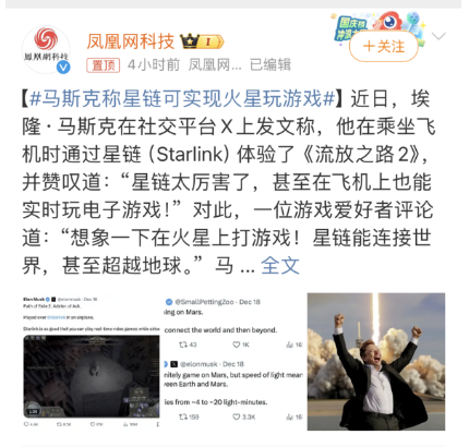 随着讨论的不断发酵,“马斯克使用星链玩游戏”的相关讨论和新闻被送上了热搜,《流放之路2》又双叒叕成为了玩家们热议的话题之一。各路网友们的脑洞也很快影响到了大洋彼岸,以至于现在大家都在畅想有朝一日能够上火星打游戏,冲出宇宙不是梦想!