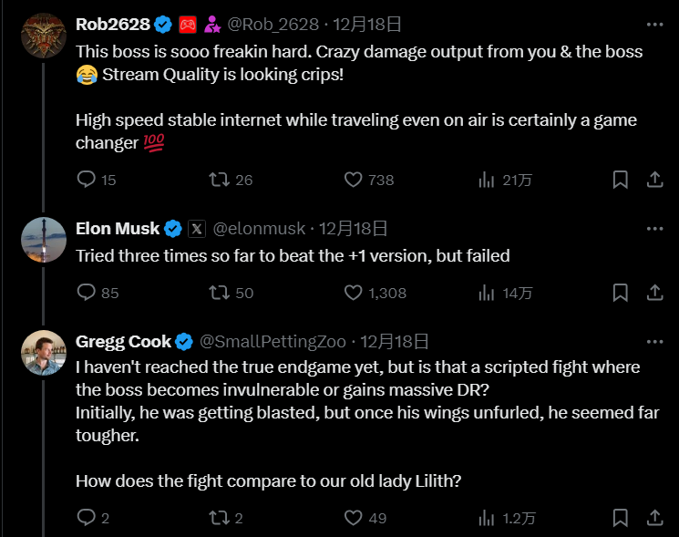 不仅是知名富豪,还是资深游戏玩家的埃隆·马斯克也是被《流放之路2》所吸引的一员,在游戏上线首日准时开挤服务器,并在之后的几天里不断通过推特与网友交流游戏的心得,看得出这位前D4榜一大哥现在已经“移情别恋”,并且乐在其中。