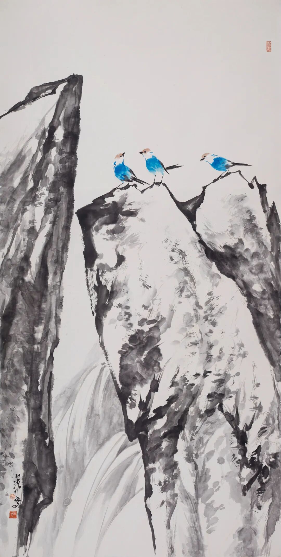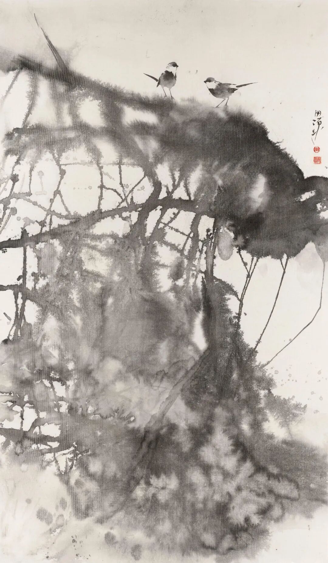山雀不再单体刻画,而以“群鸟”成阵,水墨洪流自上而下,如“瀑布”般倾泻;