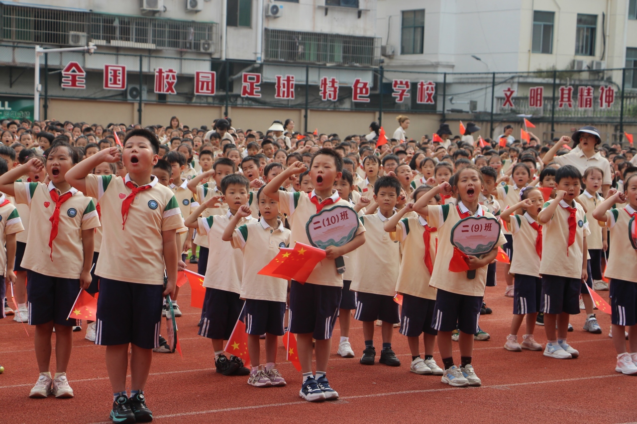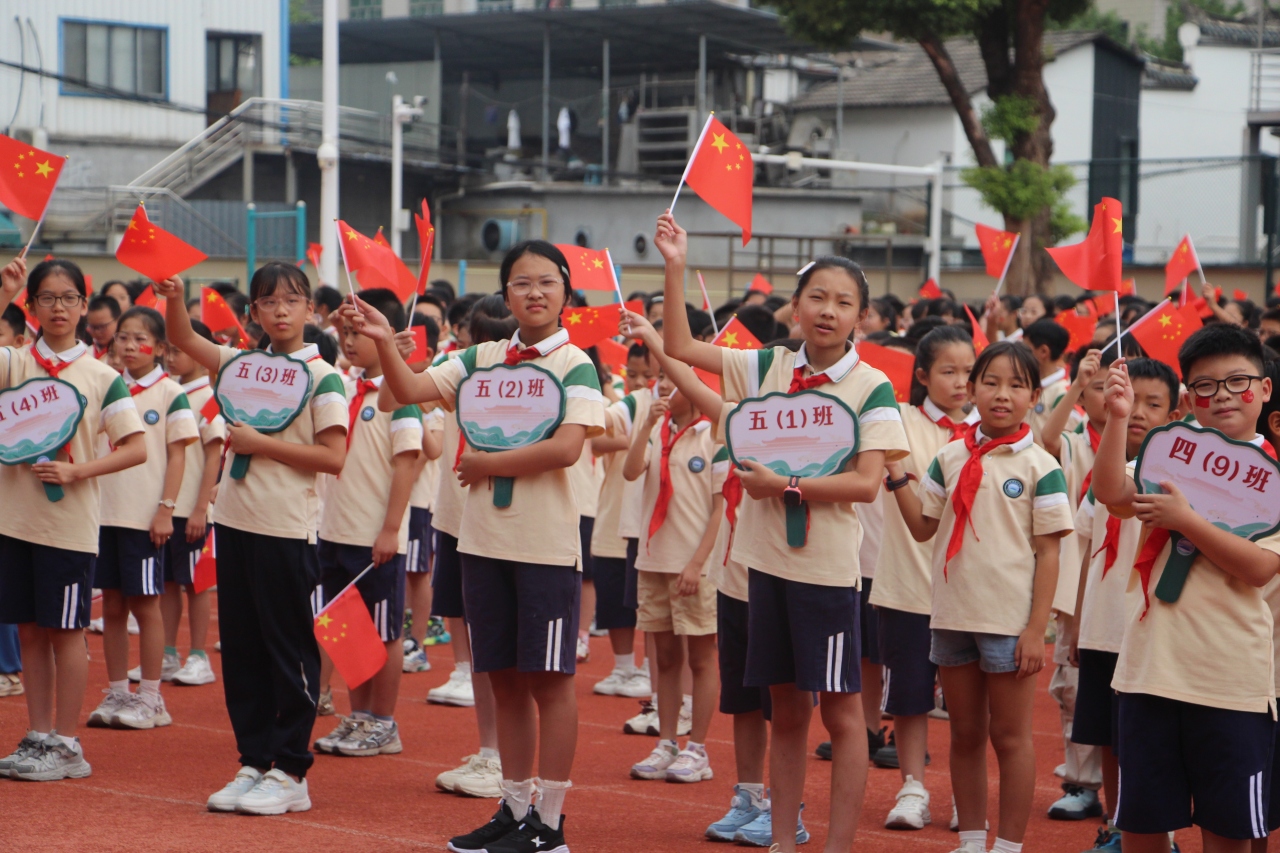 上午八点,在恢弘激昂的经典乐曲中,活动正式拉开帷幕。武义老年大学的“荣誉班长”、熟溪小学全校师生、公安干警、白洋街道社工站社工齐聚操场。少先队员们身着整齐的校服,胸前的红领巾与手中的国旗交相辉映,脸上贴着国旗贴纸,展现着新时代少年的蓬勃朝气。