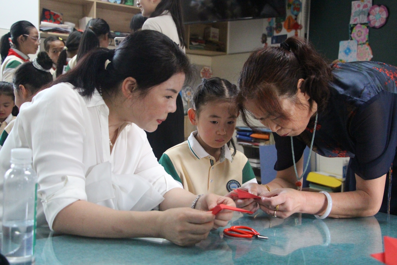 升旗仪式后,“银芽传情 礼赞国庆”剪纸活动在学校美术教室温馨上演。“荣誉班长”、一年级小班长及少先队大队干部们齐聚一堂,在剪纸老师的教导以及白洋街道社工站志愿者的协助下,用一把把剪刀、一张张红纸,将对祖国的祝福化作一幅幅精美的剪纸作品。活动现场老少同乐,银发与稚颜相映,中华优秀传统文化在指尖流转,家国情怀在心手相传中深深扎根。