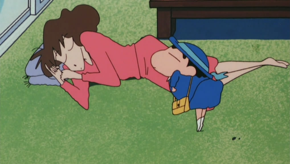 在《蜡笔小新》里【美冴刑警是纯情派哦】这一集中,小新和小葵懒洋洋地躺在榻榻米上,无所事事地滚来滚去。