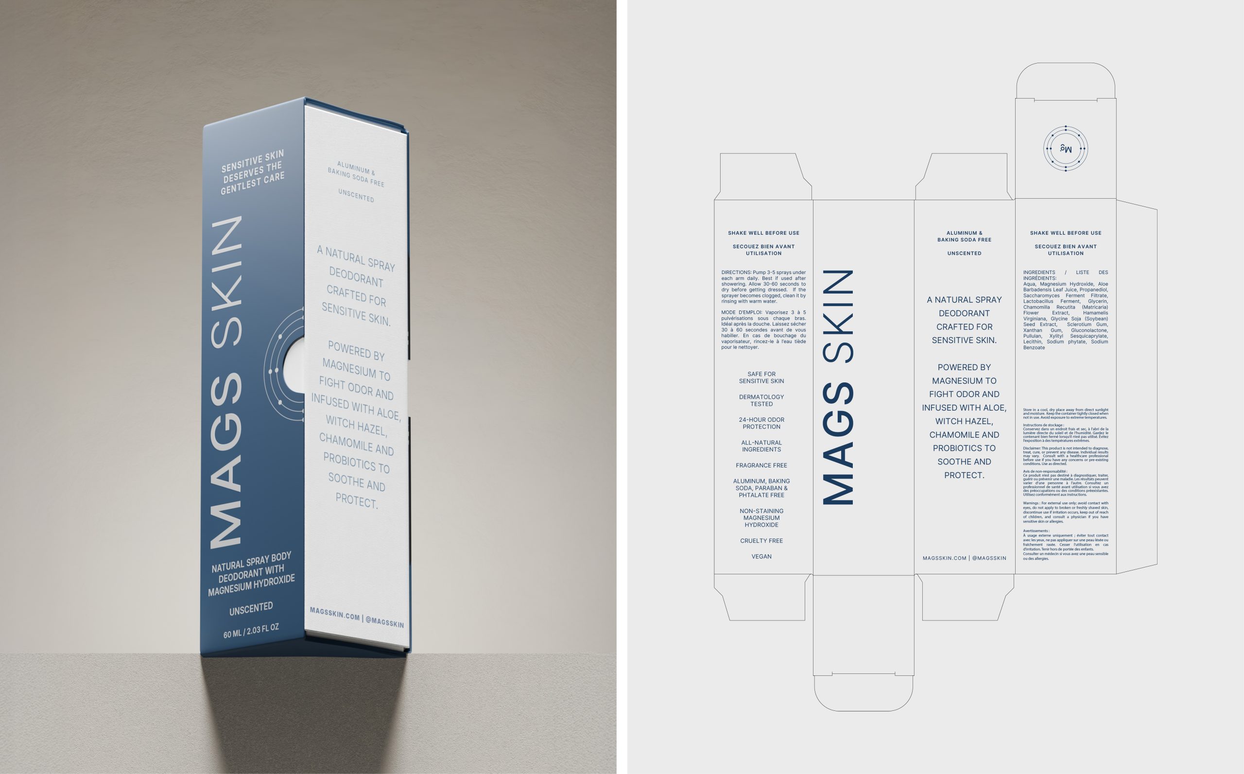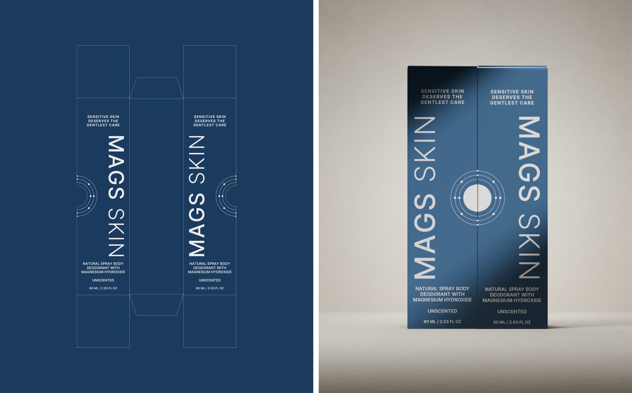 MAGS SKIN的产品包装则给人一种科技感与自然感完美结合的视觉体验。以身体喷雾为例,包装主色调采用深浅不一的蓝色,仿佛象征着纯净的自然与深邃的科技。包装上的线条和圆形图案,犹如宇宙中的轨道和星球,寓意着蕴含的科技力量,同时又给人一种自然、舒缓的感觉。