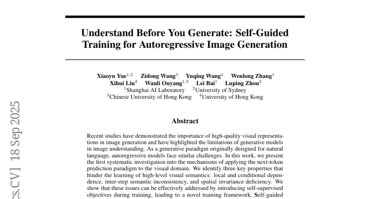 近期,上海AI实验室联合悉尼大学、香港中文大学和香港大学的研究团队发表了一项重要研究成果,题为《Understand Before You Generate: Self-Guided Training for Autoregressive Image Generation》。这项研究于2025年9月18日发布在arXiv预印本平台,有兴趣深入了解的读者可以通过 https://github.com/yuexy/ST-AR 访问完整论文和代码。研究团队由第一作者岳晓宇(悉尼大学、上海AI实验室)领导,其他核心成员包括王子栋(香港中文大学)、王玉晴(香港大学)、张文龙(上海AI实验室)等知名研究者。