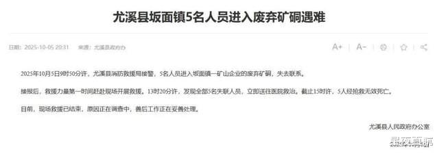 据福建省三明市尤溪县政府通报,10 月 5 日,5 名人员犹如断了线的风筝般,进入该县坂面镇一矿山企业的废弃矿硐后失联。救援力量风驰电掣般赶赴现场,将 5 名失联人员救出,但 5 人却如凋零的花朵般,经抢救无效死亡。5 日晚,记者从尤溪县官方获悉,事发地是位于坂面镇肖坂村的一个金矿,该矿如沉睡的巨兽般已关停多年,涉事的废弃矿硐硐口也如紧闭的城门般早被封闭,此次不知是何缘由被人打开。