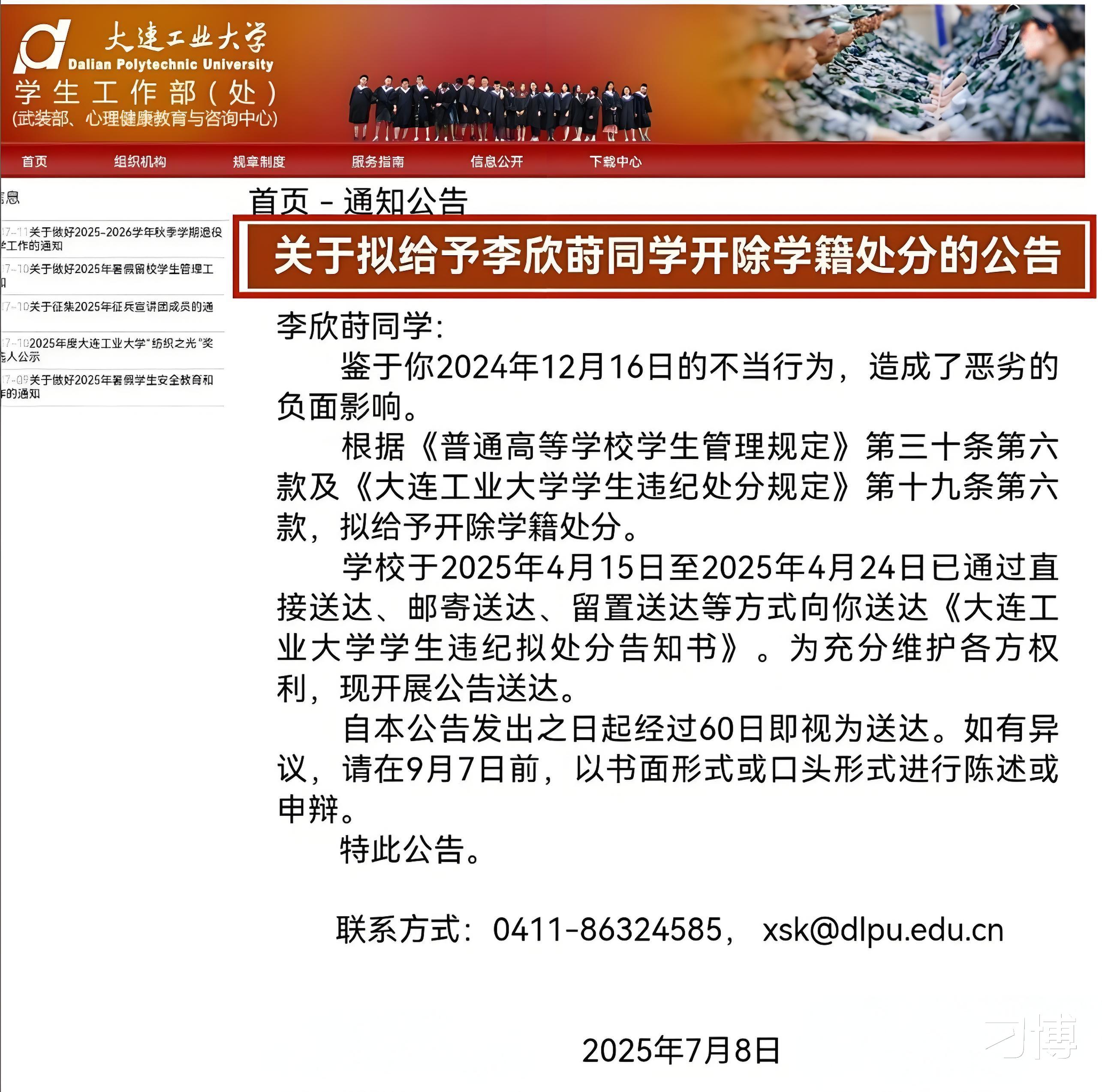 从大连工业大学的发布的公告可以看到,学校在今年4月已通过多种方式试图将处分告知书送达李同学,奈何均未成功。只好以此方式送达。拟开除学籍的依据是《普通高等学校学生管理规定》中的“其他不能完成学业、应予退学的情形”,以及《大连工业大学学生违纪处分规定》中的“与外国人不正当交往,有损国格、校誉的,视情节给予记过及以上处分”。