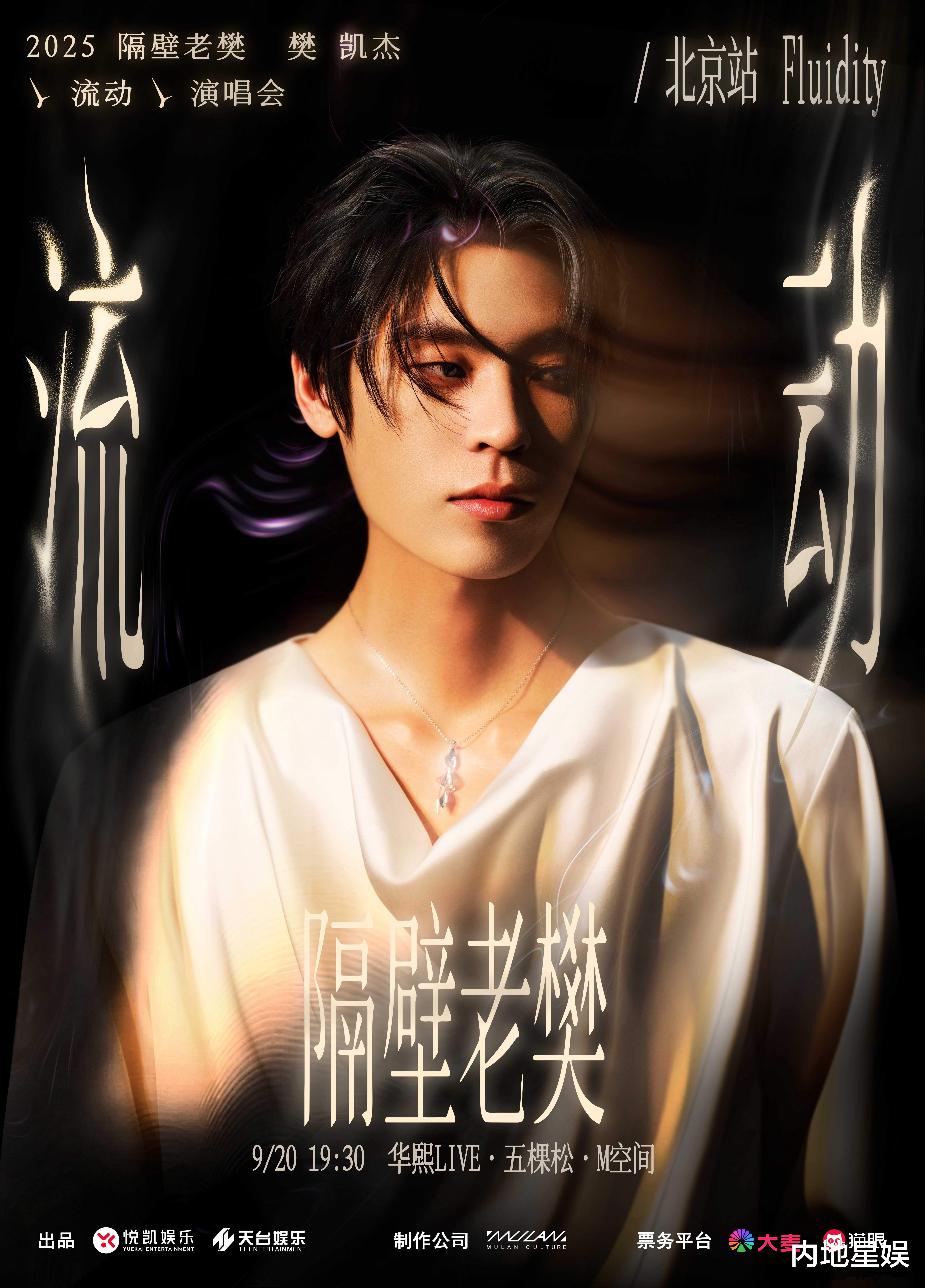 2025年9月20日,隔壁老樊_樊凯杰「流动」演唱会即将在北京华熙Live·五棵松·M空间温情开唱。本场演唱会以“流动”为主题,旨在通过音乐诠释生命中的变迁与适应,以真诚从容的姿态面对生活的洪流。演出将依托樊凯杰多年来的经典作品,完成一场“从音乐到现场”的温暖重逢!演唱会的舞美设计尤为匠心独运,巧妙融入了“水”的流动意象与前沿光影技术,力图构建一个充满呼吸感的沉浸式视觉空间,不仅强化音乐的情感张力,也象征生命自然的流动与延伸。自出道以来,樊凯杰始终以真挚叙事和朴实深情的演唱风格,唱出普通人的内心世界,被誉为“青春时光胶囊”。此次「流动」演唱会,他希望延续这一温暖真诚的音乐叙事,并尝试在音乐表达和舞台艺术上实现新的突破,邀请观众共同奔赴一场关于时间、生命与自我的音乐之旅。