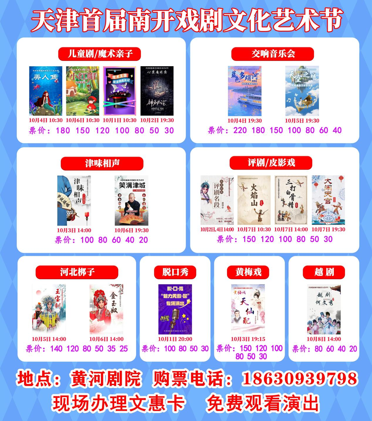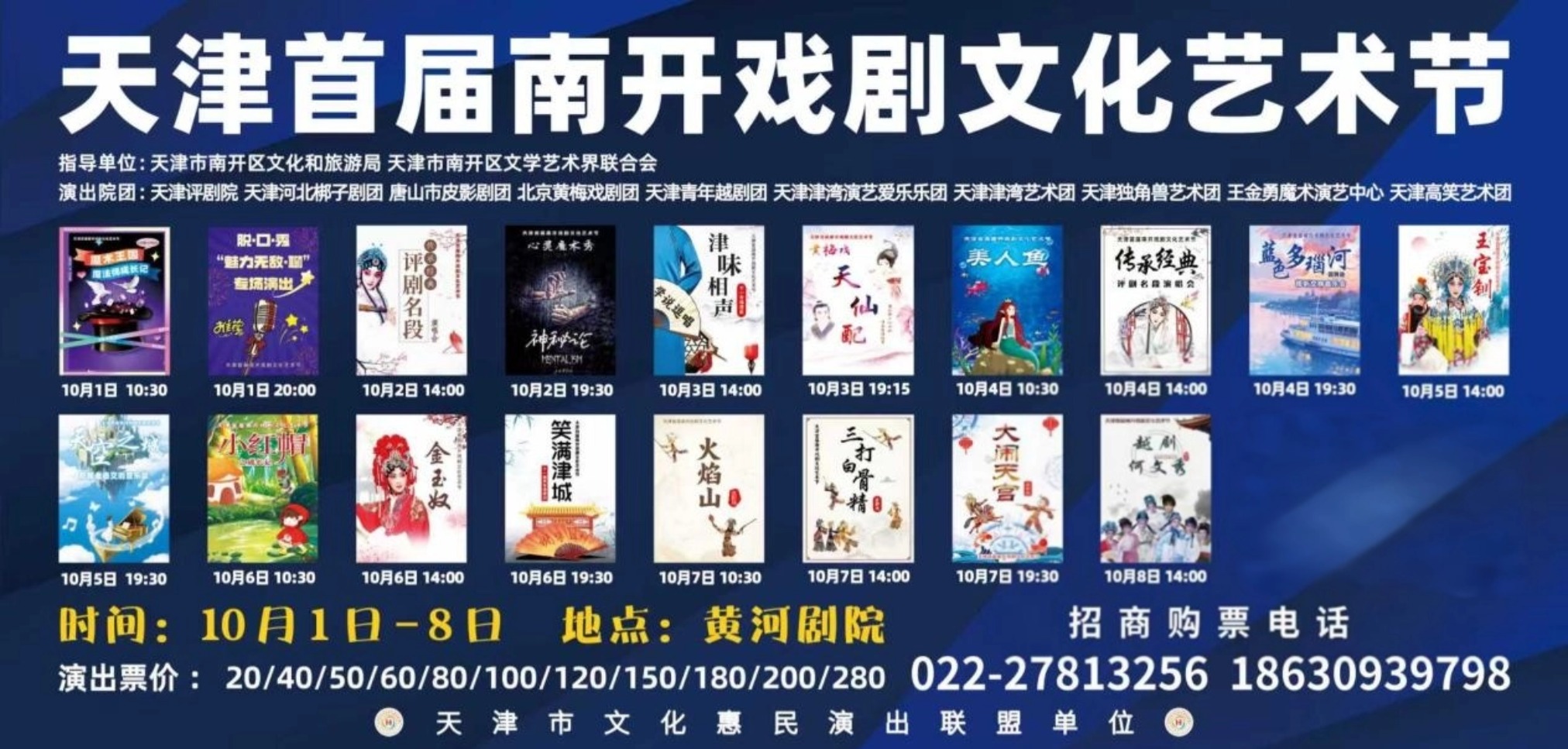 天津南开首届戏剧文化艺术节十一长假期间精彩不断。喜欢看演出的观众将有眼福了,10月1至8日连续8天在南开区黄河剧院将演出河北梆子、评剧、越剧、皮影戏、儿童剧、魔术亲子秀、大型交响乐、相声、脱口秀等精彩演出,好戏连台。赵津生,张俊玲、王馨平,剧文林,徐雯,康佳伟、王金勇,王晨,张翠香,刘红雁,张晓明,何池,高伟,刘可晨,郭政,白津生,杨威等多位名家齐聚黄河剧院,为广大观众带来精彩演出。