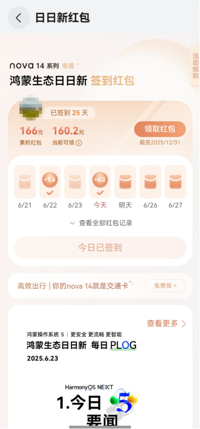 这次华为nova 14系列上线后,以旧换新活动特别给力,不限旧机品牌,焕新补贴统一为旧吉回收金额的30%,单台至高补贴600元。还有一点一定要提醒各位:鸿蒙红包现在可以直接提现了!每天签到累积到第30天后,点领取红包就能提到华为支付账户上。很多朋友签完都忘了提,记得提一下。