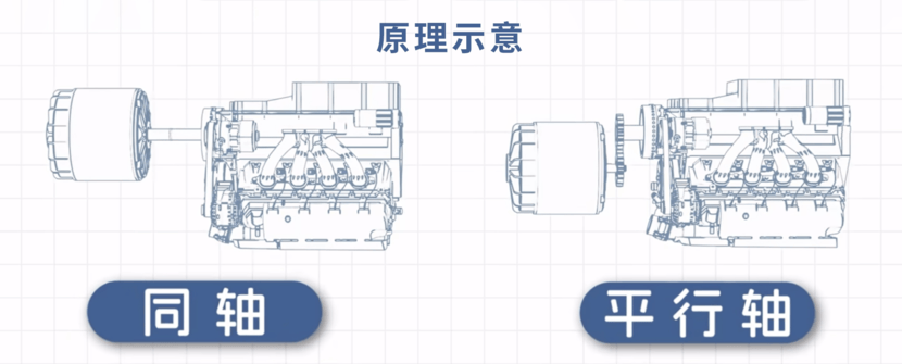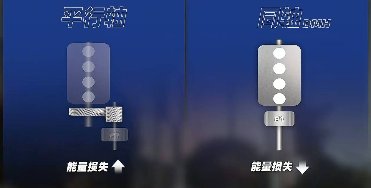 区别是什么?区别在于荣威DMH 6.0混动系统的P1电机与发动机是刚性连接,发动机转,P1电机就跟着转,用一句不算很恰当的话来概括,那就是“一根绳上的蚂蚱”;而吉利雷神AI电混、比亚迪DM等混动系统平行轴的设计布局则多了一组齿轮,通过齿轮啮合带动P1电机工作。