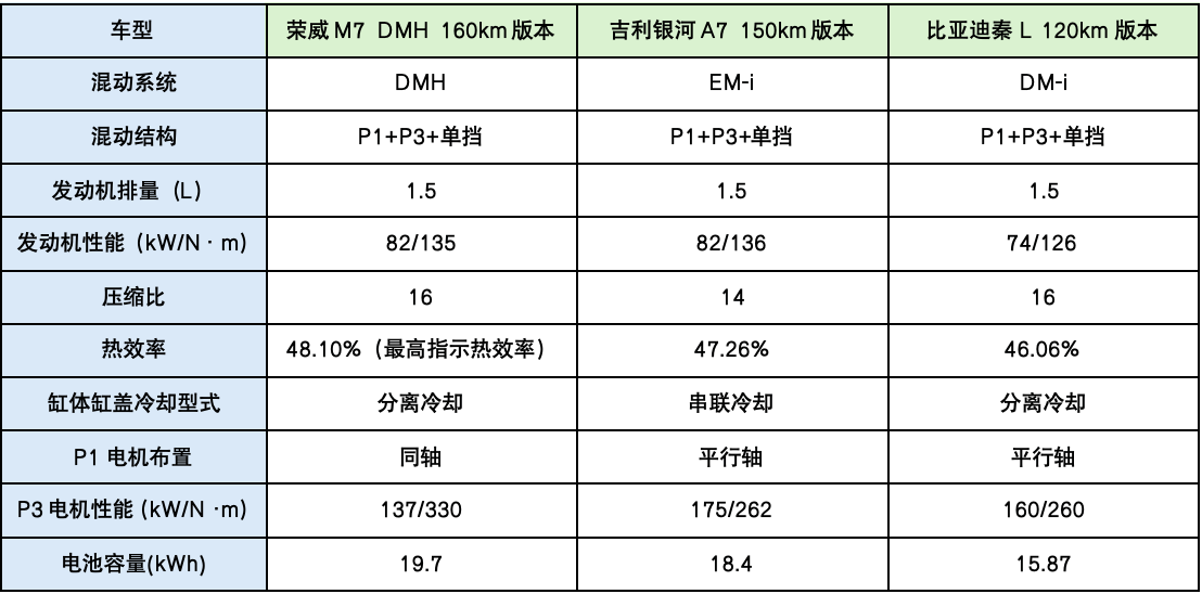 此外,不难发现,荣威M7 DMH的电池容量相比银河A7和比亚迪秦L DM-i也明显更大,19.7kWh的容量,纯电续航160km,要强调的是,这是全系标配,而两款竞品车型的纯电续航最低分别是70km与80km,最高分别是150km与120km。