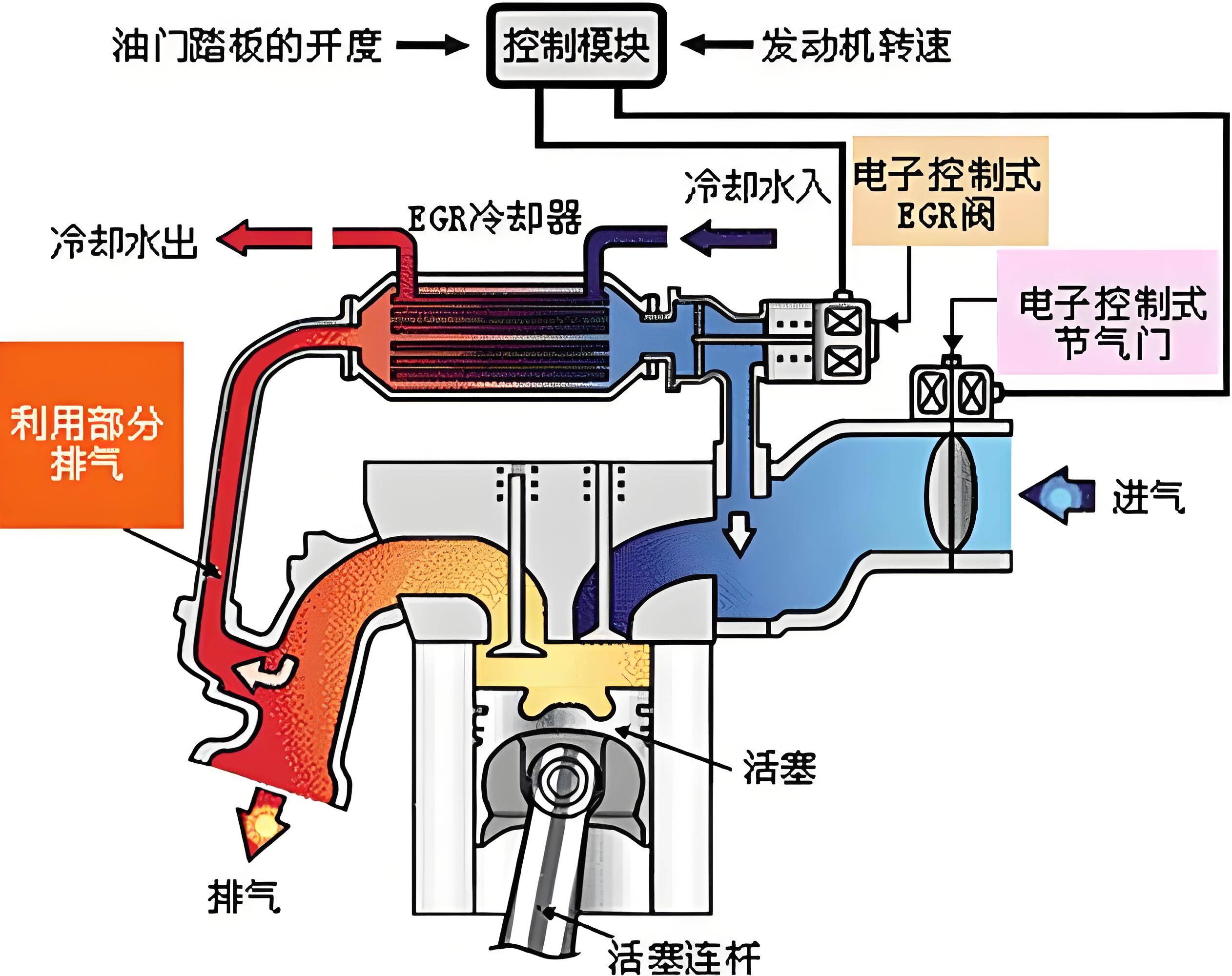 外部冷却EGR技术则是根据发动机运行工况及工作温度,将一部分废气回送到进气歧管,并与新鲜混合气一起再次进入气缸燃烧,而废气中含有大量二氧化碳等多原子气体,它们不支持燃烧但却有很高的比热容,能吸收大量的热,降低燃烧室温度,改善发动机爆震、降低燃油消耗、降低排放,实现行业领先的EGR率30%+。
