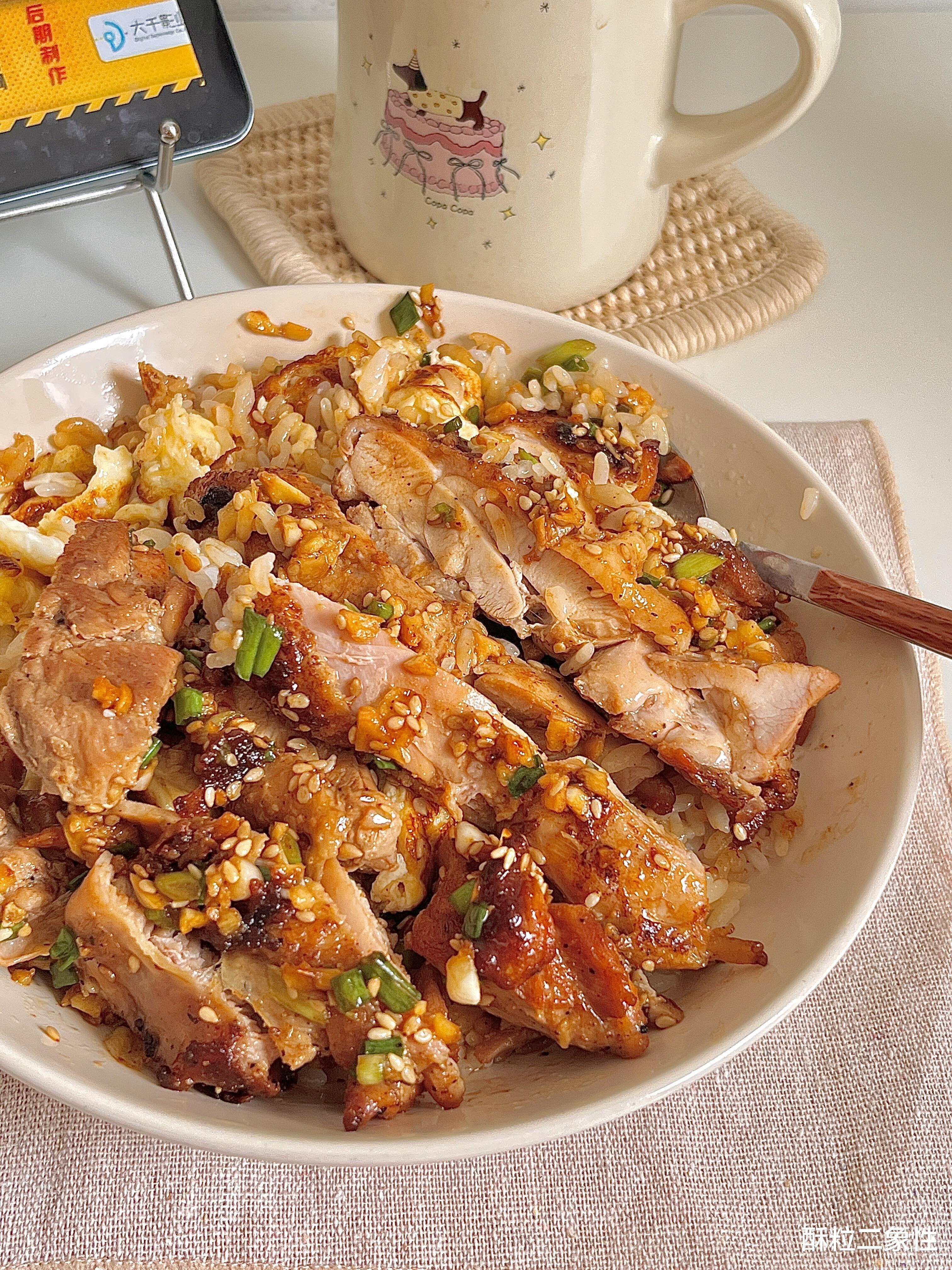 组装时刻像拆盲盒。热米饭垫底,焦皮鸡腿切块码上,皮面朝外,摆成一圈小太阳,中间丢滑蛋,最后把锅里剩余盐葱酱全部浇顶。绿的绿、黄的黄、白的白,颜色炸到离谱。一勺下去,焦皮“咔嚓”碎裂,鸡汁顺着米饭往下淌,滑蛋被戳破,奶香蛋浆抱住葱粒,咸鲜、焦香、葱甜、蛋奶在口腔里开趴,我原地旋转,像被饭勺击中太阳穴,幸福到冒泡。