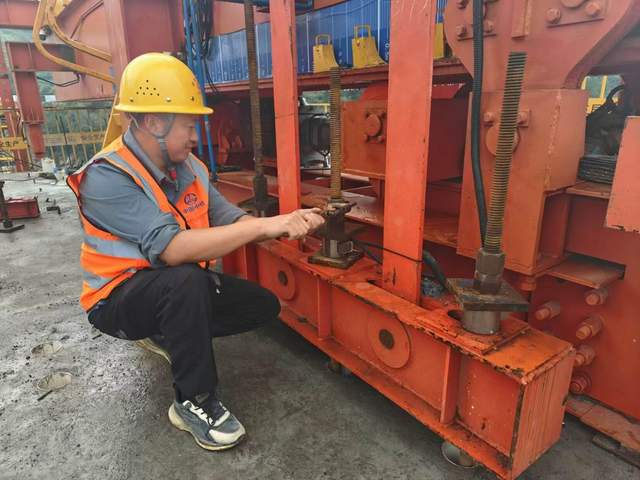 “国庆不打烊,进度不能挡!”在合武高铁安徽段梓树湾白沙河特大桥施工现场,机械轰鸣声此起彼伏,班组长张建民的吼声穿透嘈杂声响,格外清晰有力。这座大桥地处大别山腹地,大桥(60+100+60)米双线连续梁跨越白沙河,其中15#主墩墩高56米,是全线最高的连续梁主墩,施工难度大、安全风险高。当天的任务是完成15号主墩第四节段挂篮前移作业。这是自行式挂篮施工的关键工序,对移动挂篮的走行精度需控制在毫米级。“挂篮就像‘空中走廊’,每移动一厘米都得慎之又慎,国庆期间更要守住‘零误差’底线。”张建民一边说着,一边俯身检查锚固系统的螺栓,手指反复摩挲着螺帽,确认每一处都紧固到位。