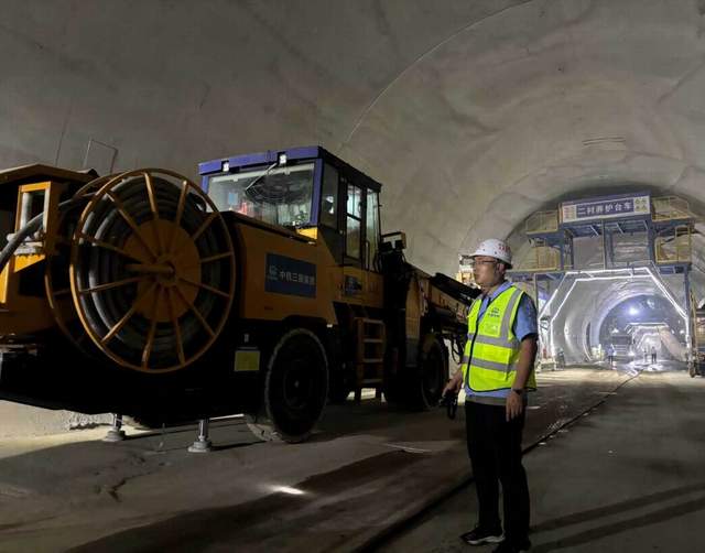 与此同时,在大别山隧道进口的施工作业面,另一组建设者正与 “岩”共舞。隧道地质复杂,多为硬岩与破碎带交替地层,掘进难度极大。“国庆期间,我们要确保日进尺达到3.5米,比平时还要快0.5米!”隧道队队长张大强看了看身旁的三臂凿岩台车,眼神坚定。为了实现目标,班组采用“两班倒”制度,24小时不间断施工,他自己则每天在隧道里待10个小时,从隧道出渣到掌子面支护,每一个环节都亲自盯控。