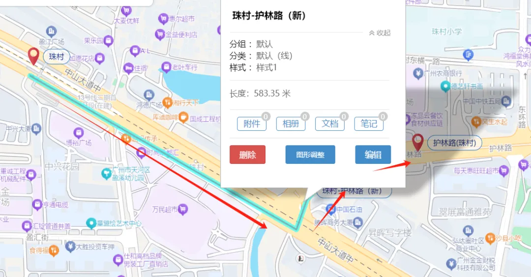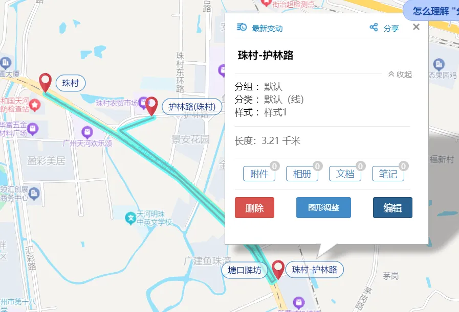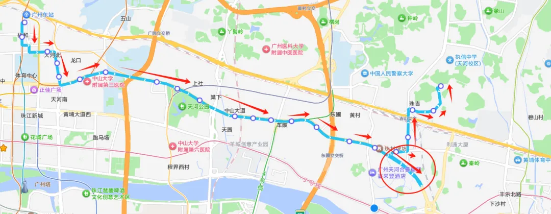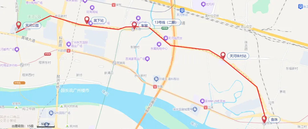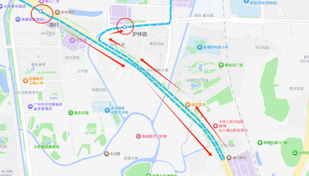 放大图中我圈出来的区域,可以看到由珠村-护林路站是要绕一个大弯的,到塘口牌坊才能掉头过到对面。