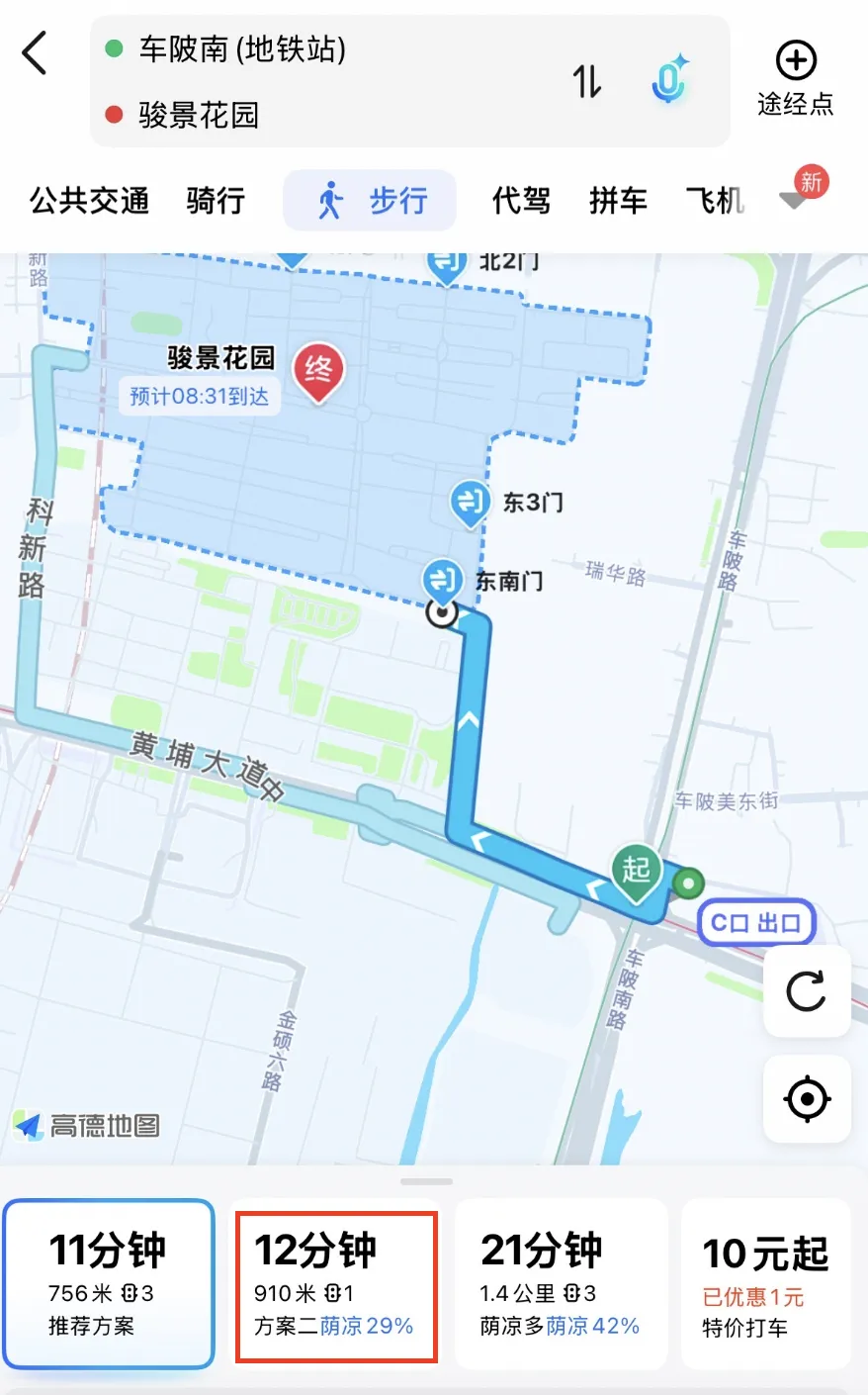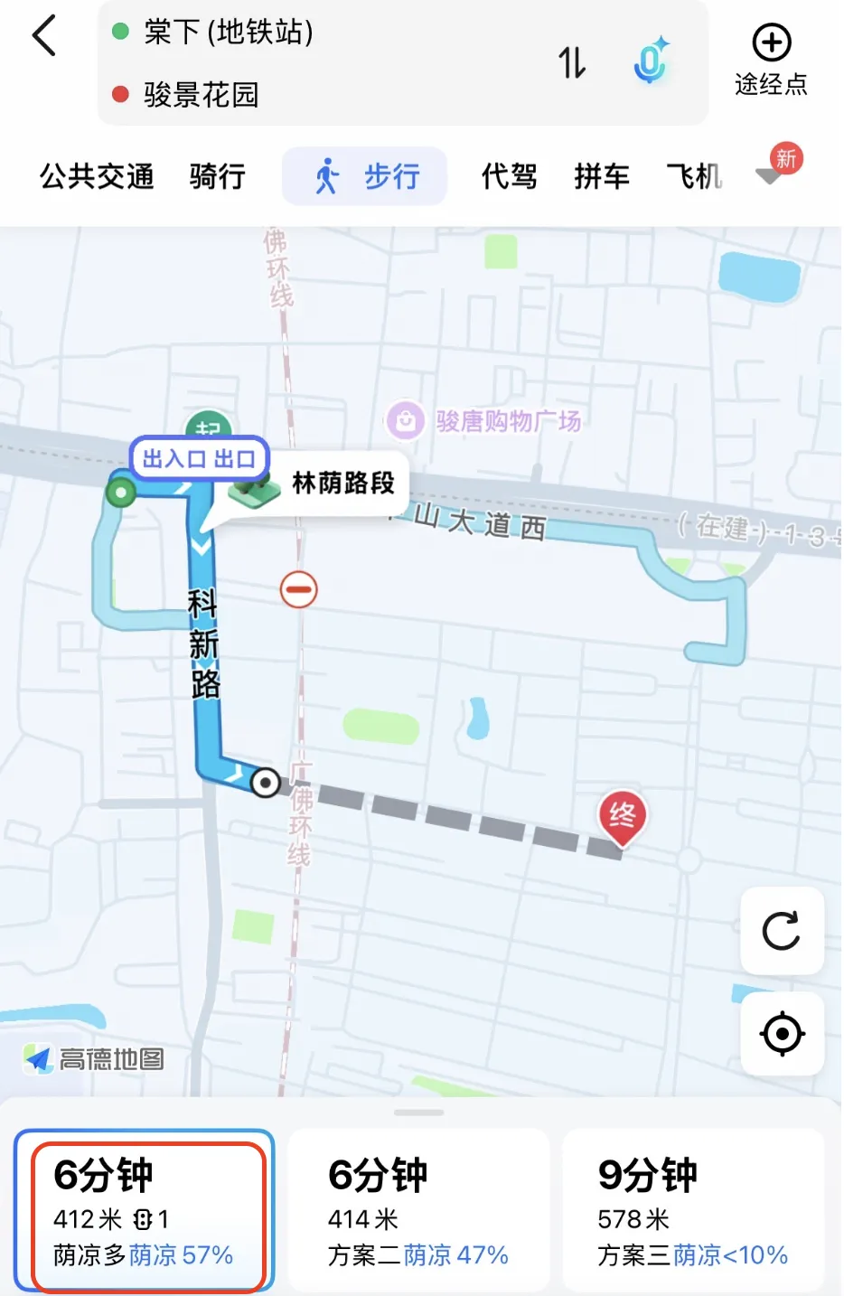 13号线二期未开通之前,离骏景花园最近的地铁站是车陂南,步行要12分钟左右,且阴凉率只有29%。