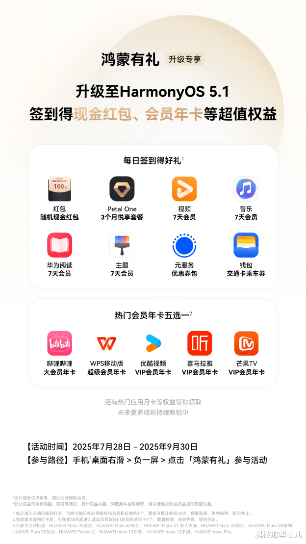 而且,升级鸿蒙5.1之后,我还在负一屏发现了“鸿蒙有礼”活动,每天签到都能领些权益,而且我就领到了一份华为阅读的7天免费会员卡,另外还能领到3个月Petal One悦享套餐,其中也包含华为阅读会员服务,能免费畅读百万好书,简直不要太爽。